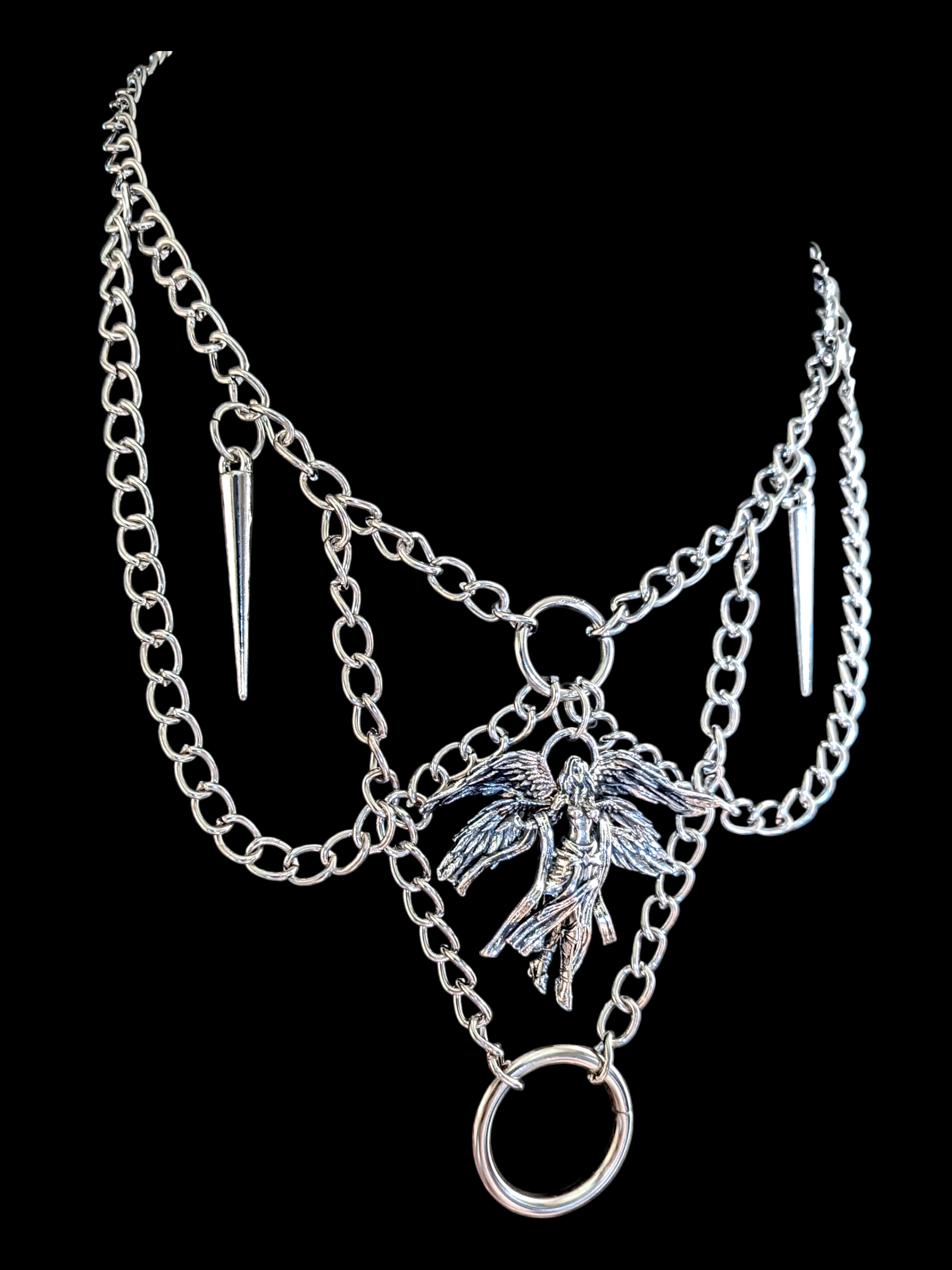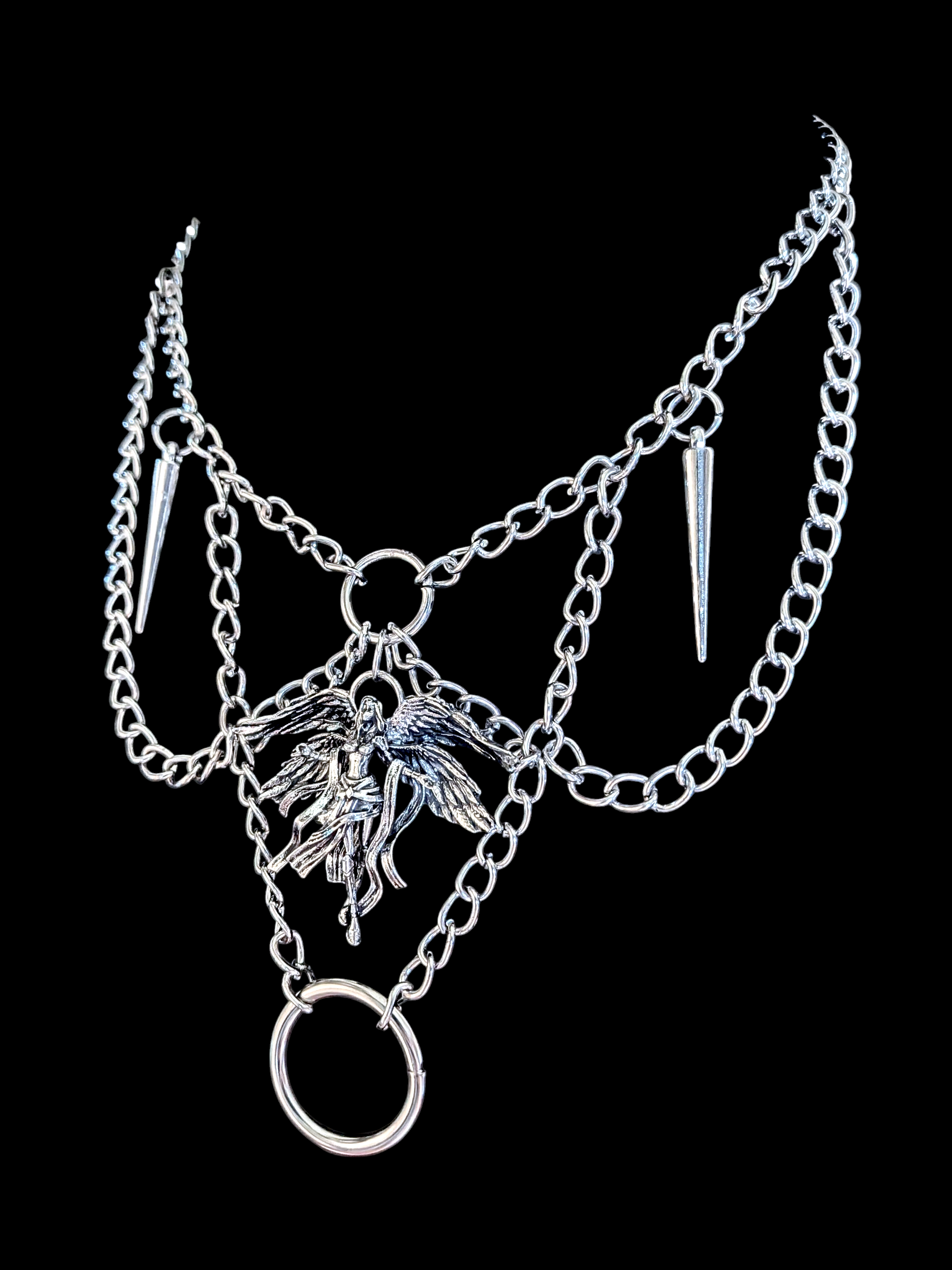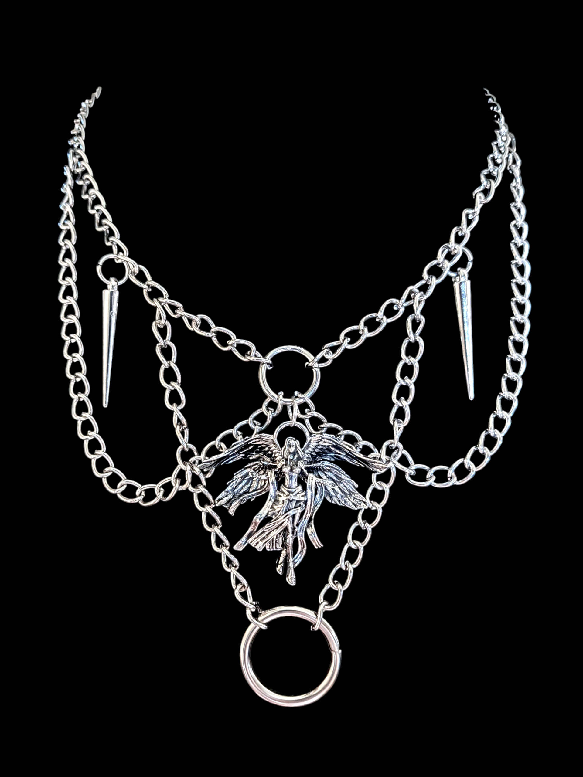 REPLICABLE Handcrafted Gothic and punk stainless steel chain mail necklace, centered with a large Gothic angel pendant.