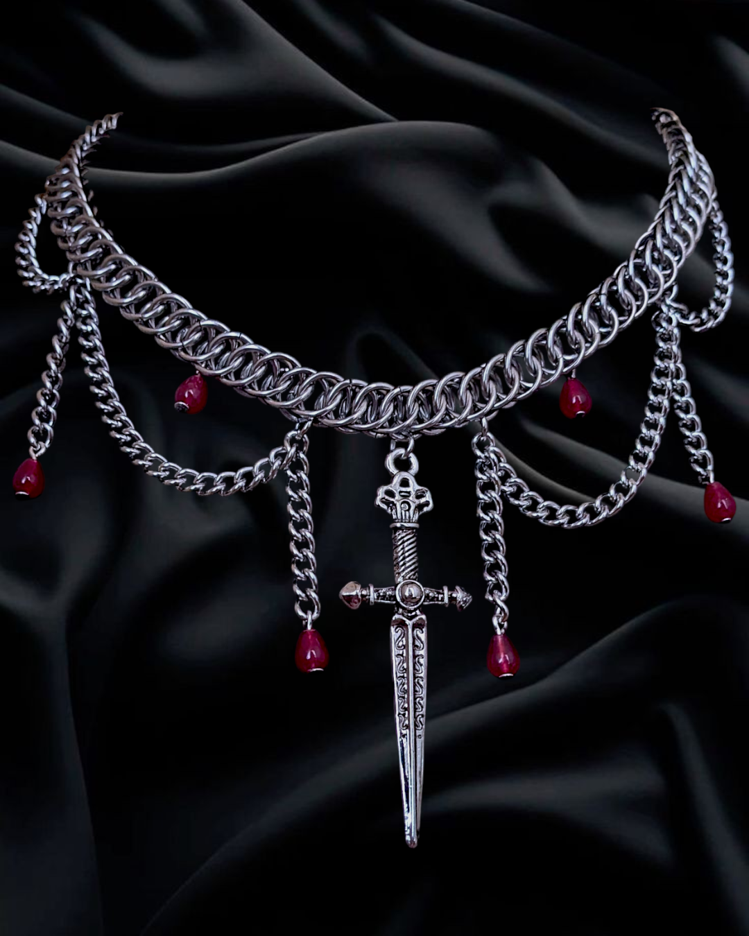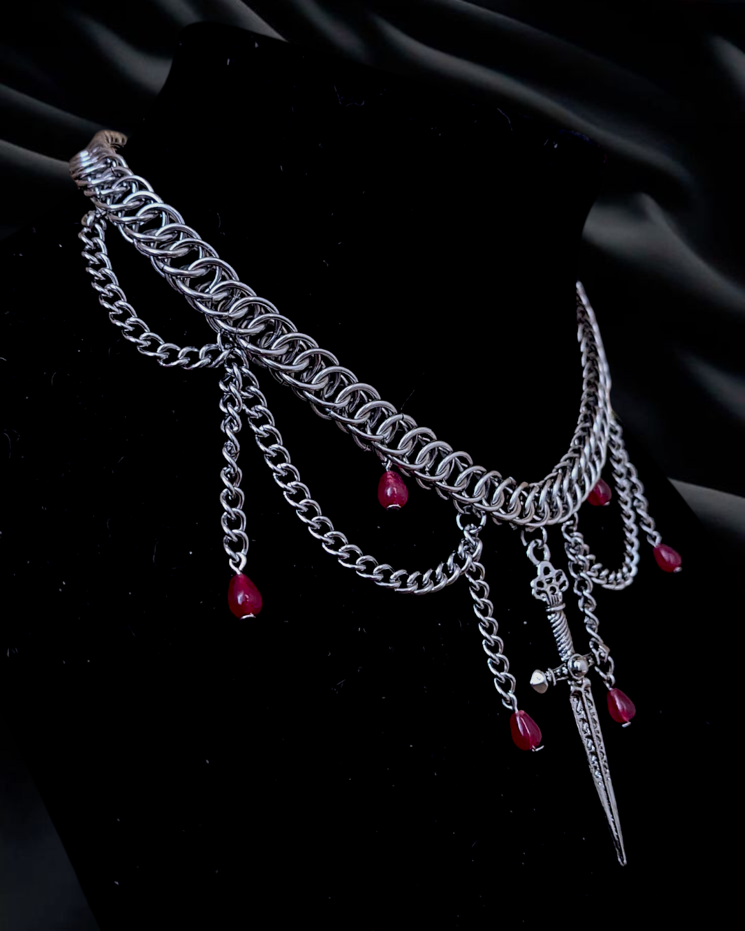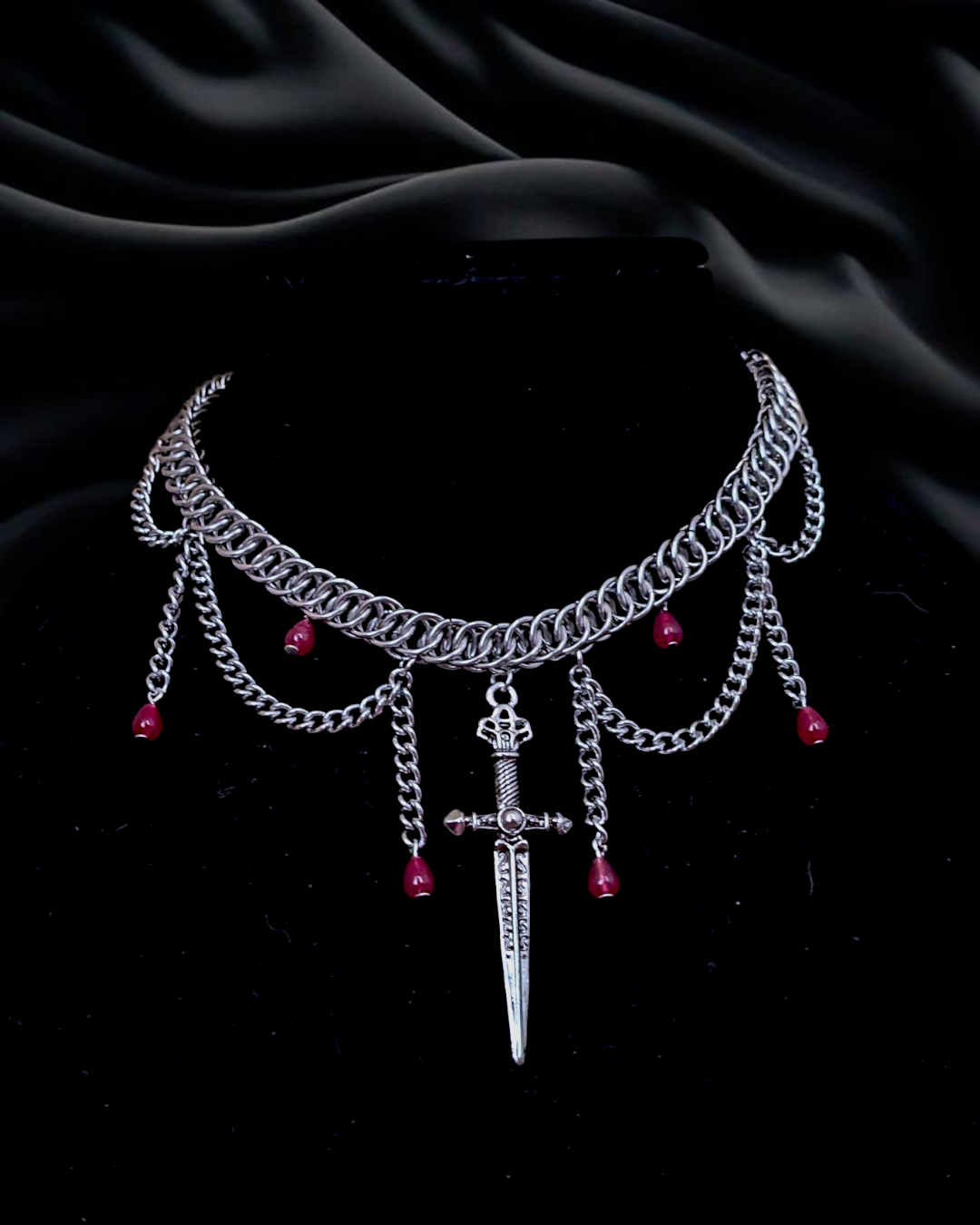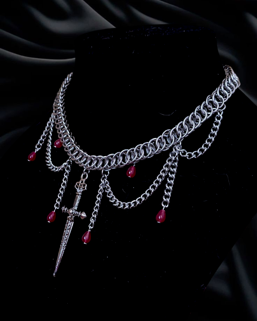 Handmade chain mail necklace centered with a large sword charm, and red beads.