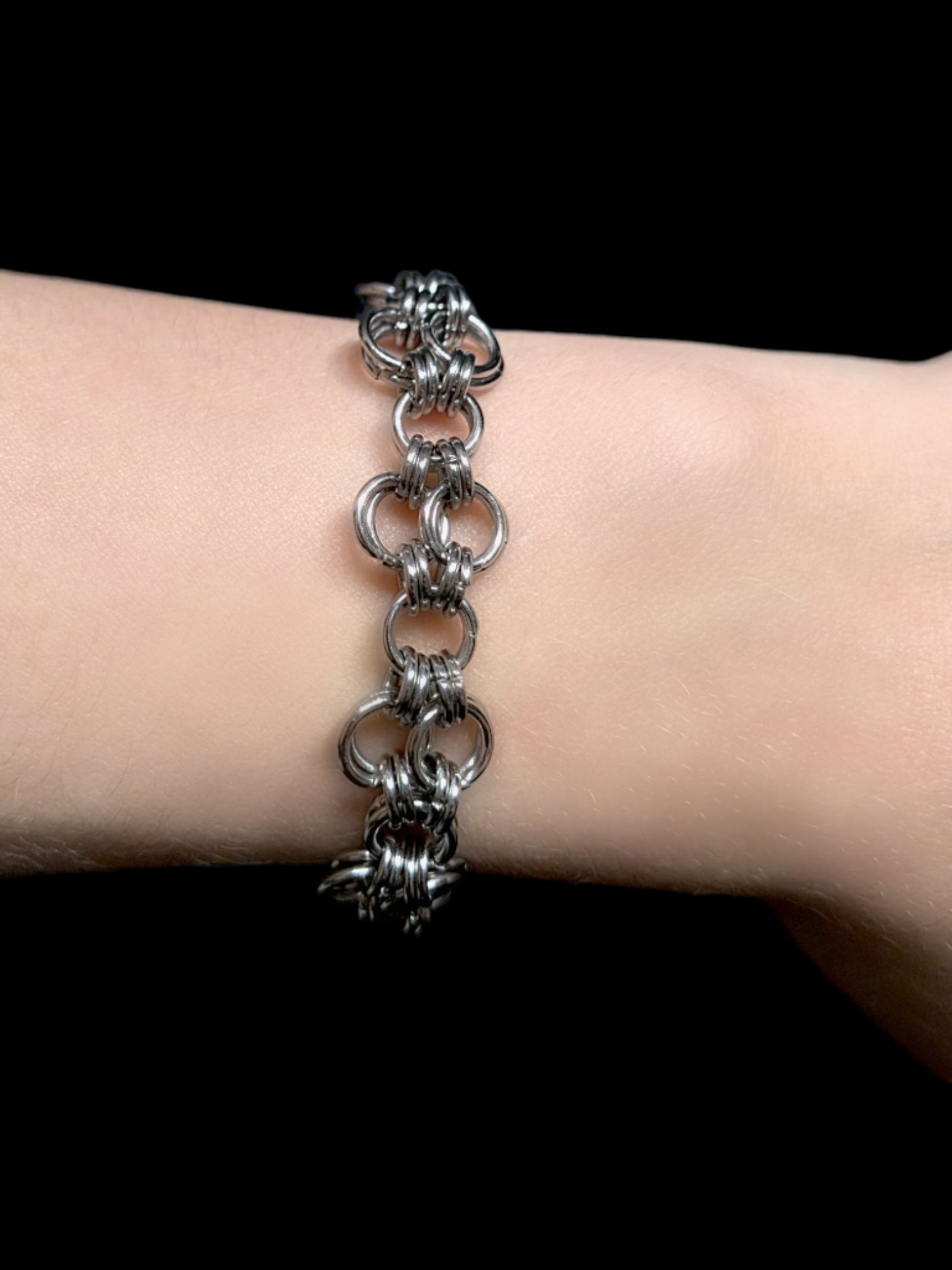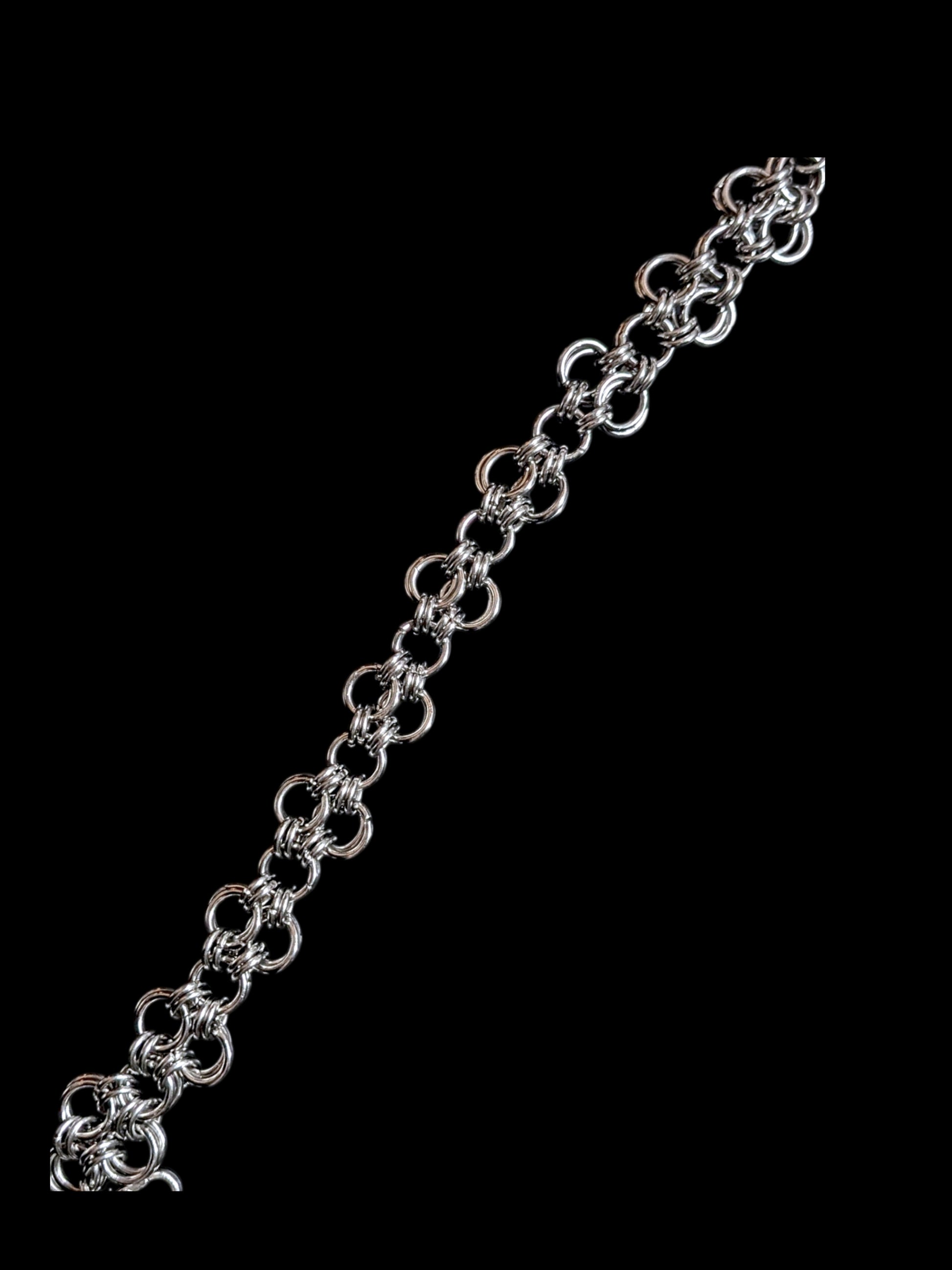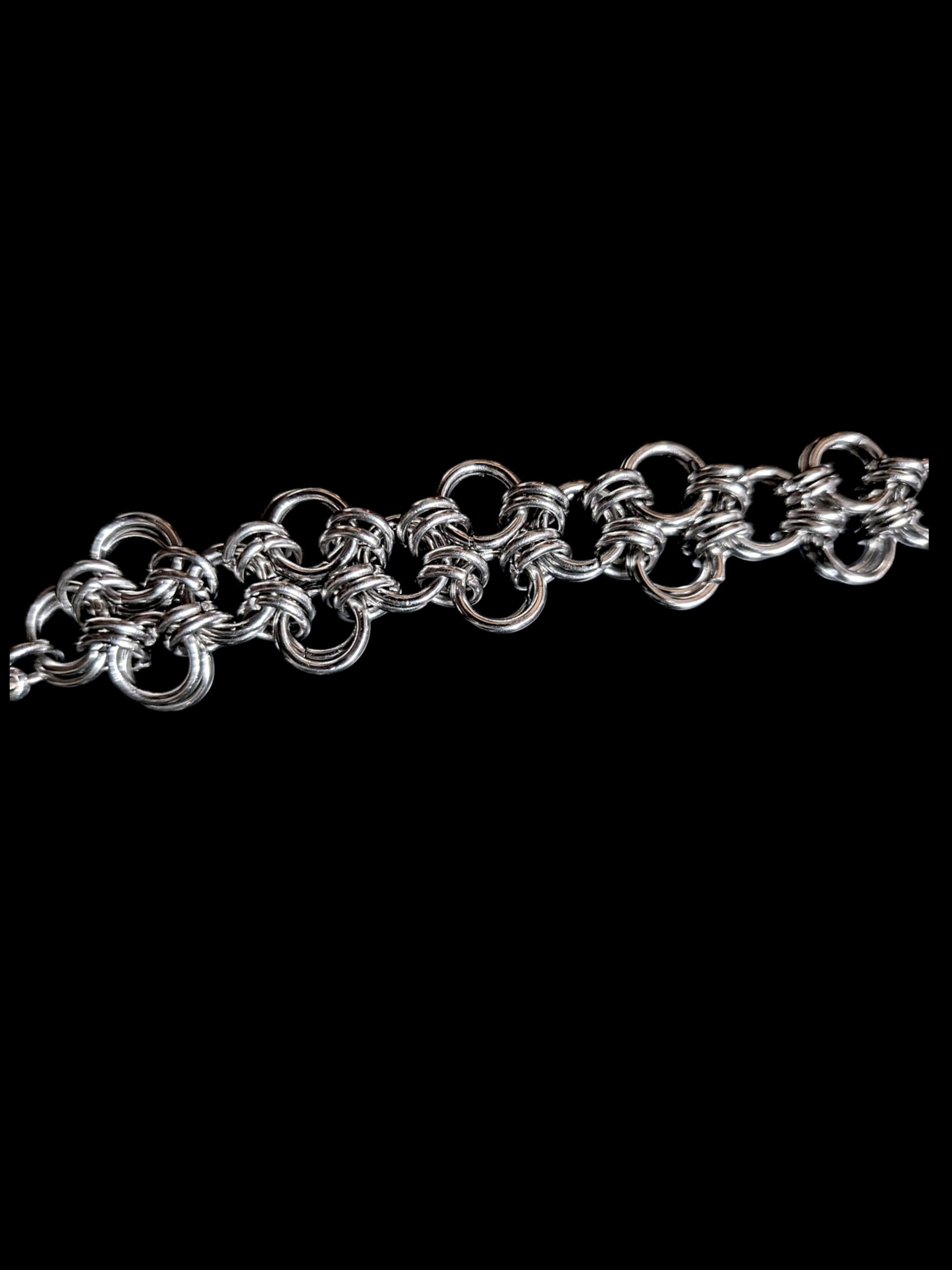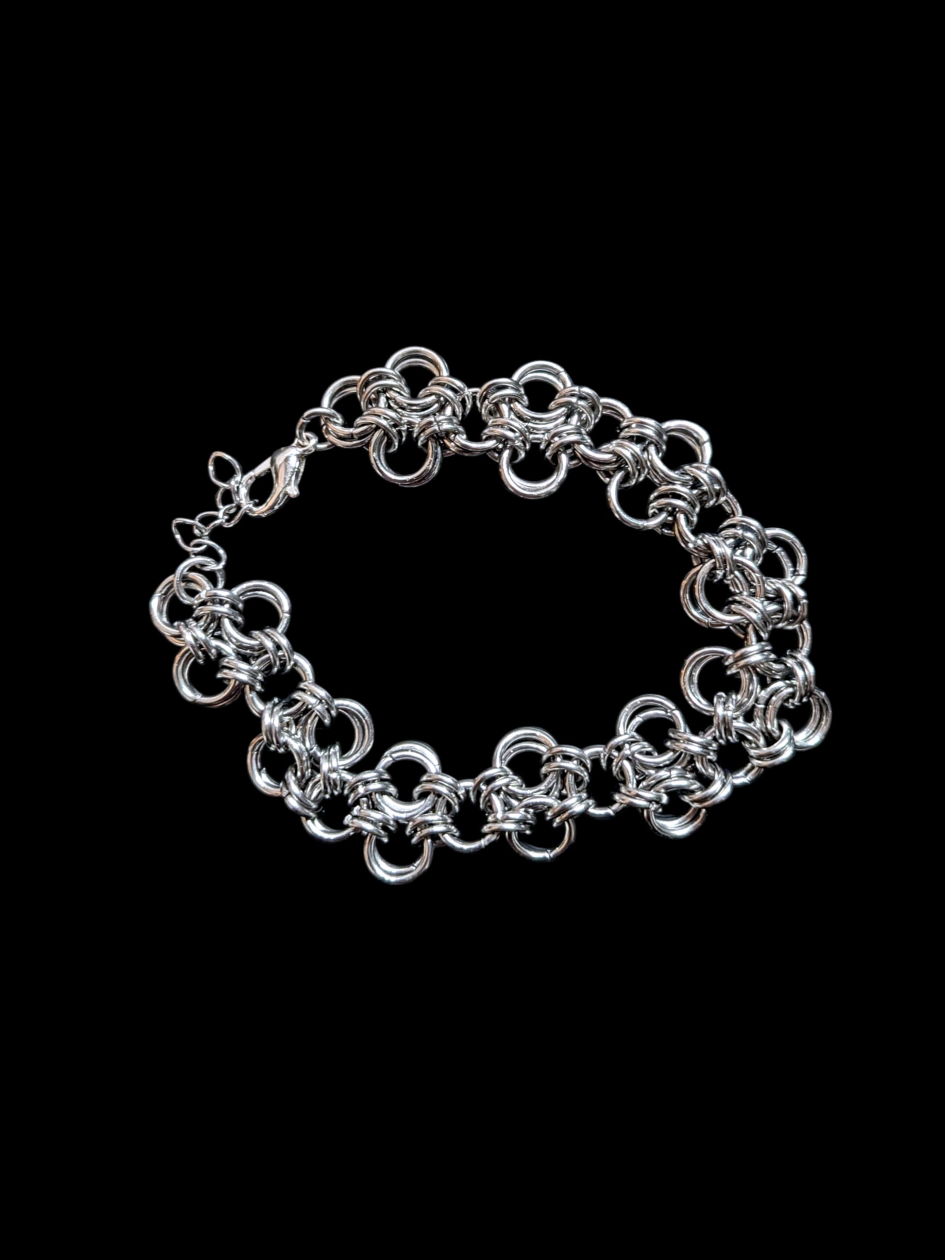 Handcrafted stainless steel chain mail bracelet. Adjustable, roughly 9" at max adjustment length.