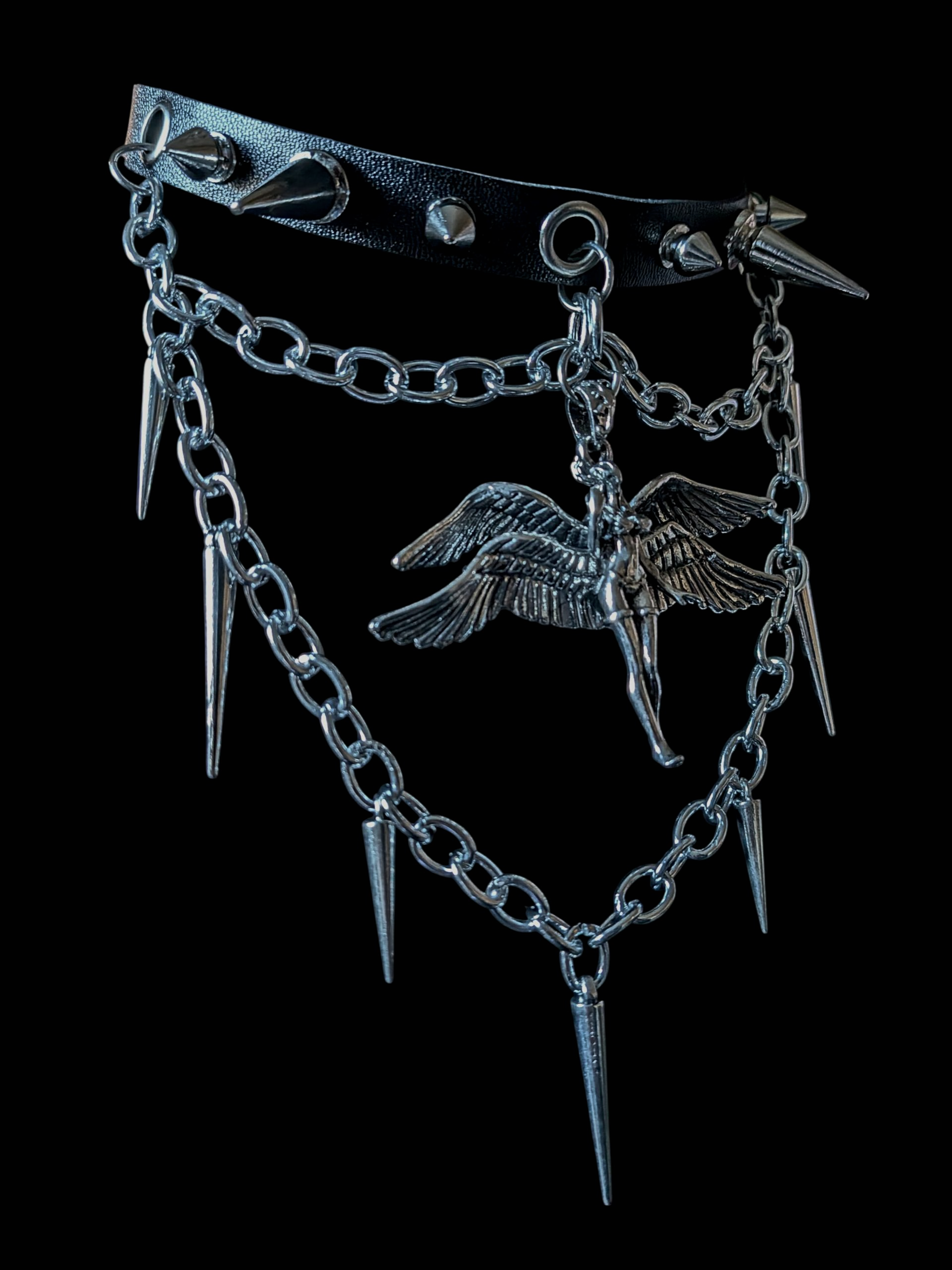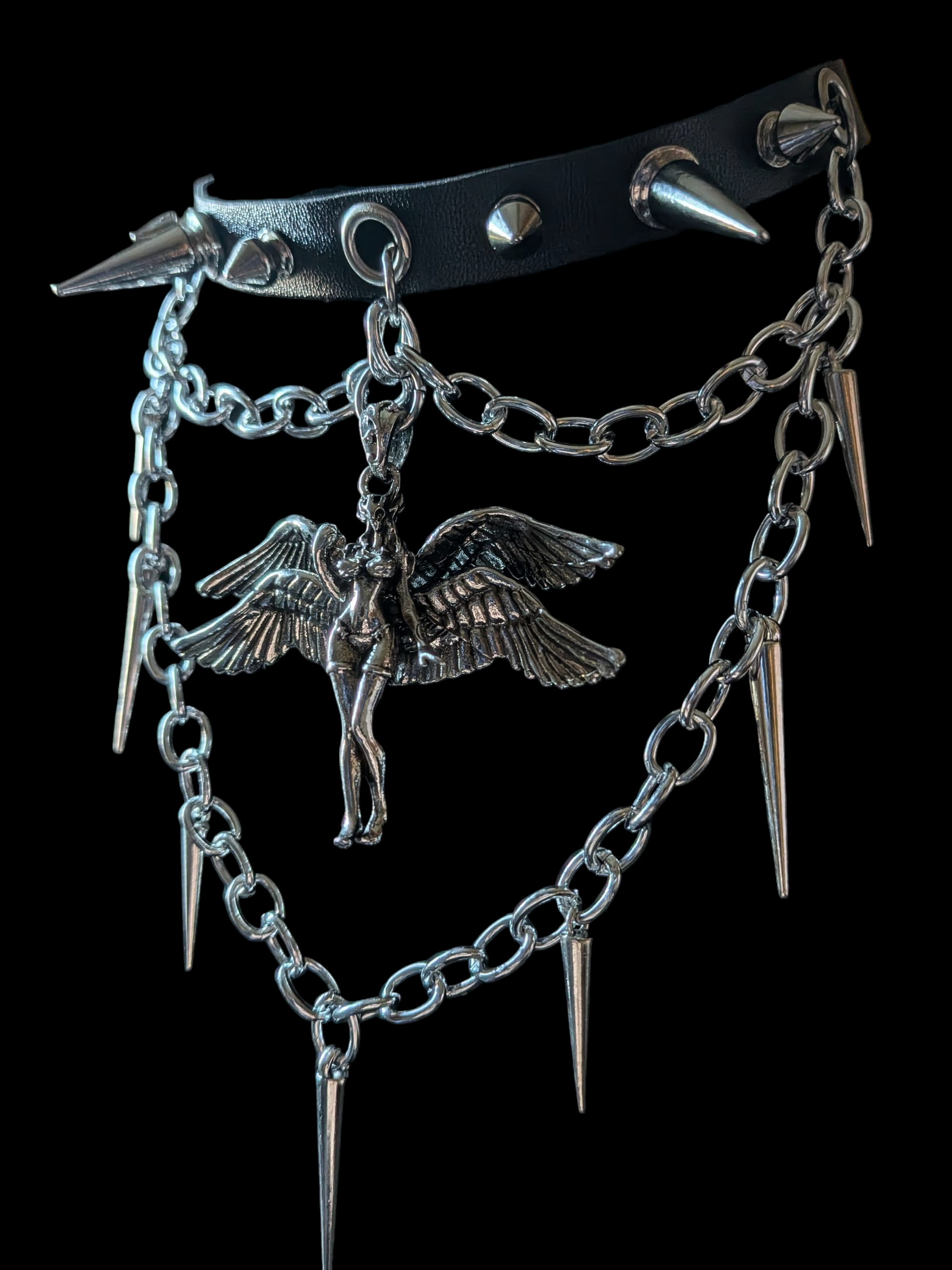 Handcrafted faux leather choker with silver chains, spikes, and angel pendant. REPLICABLE