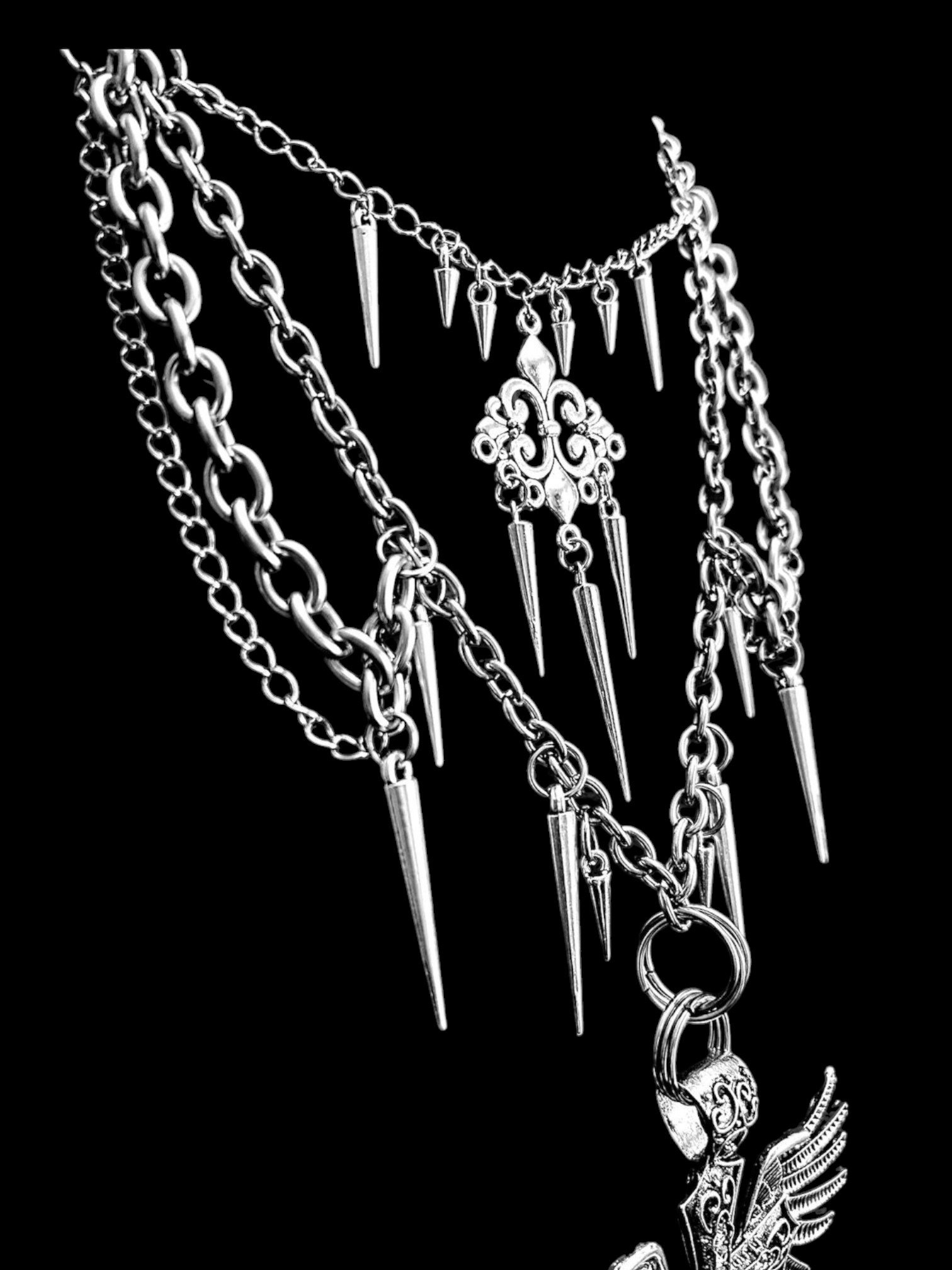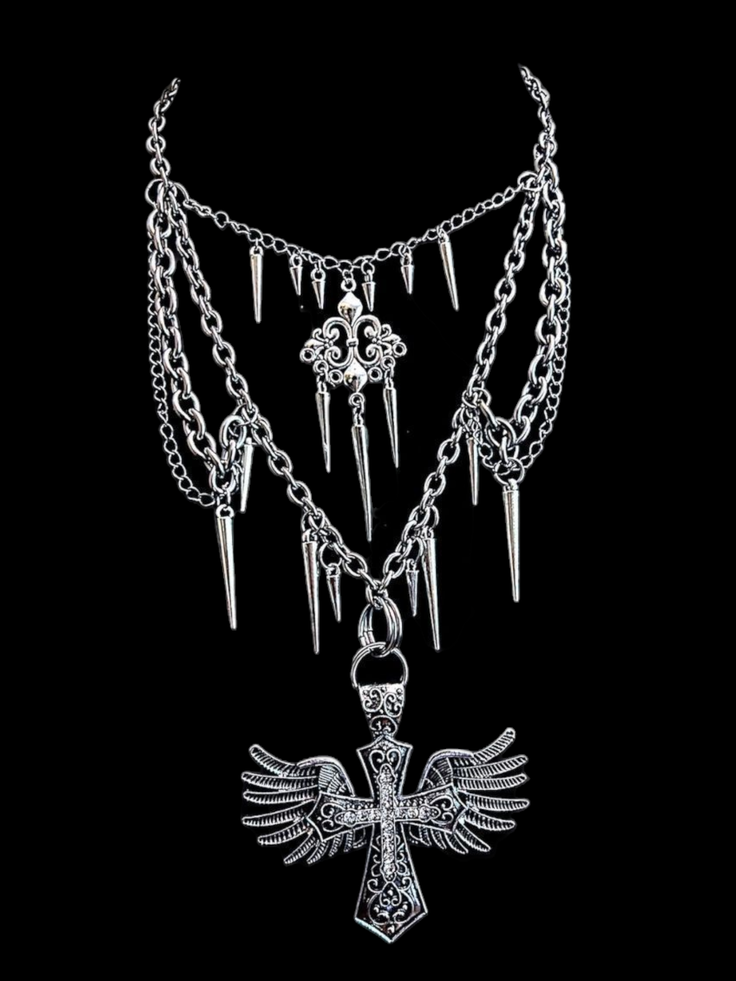 Handcrafted necklace using a cross charm, chains, and metal spikes! REPLICABLE