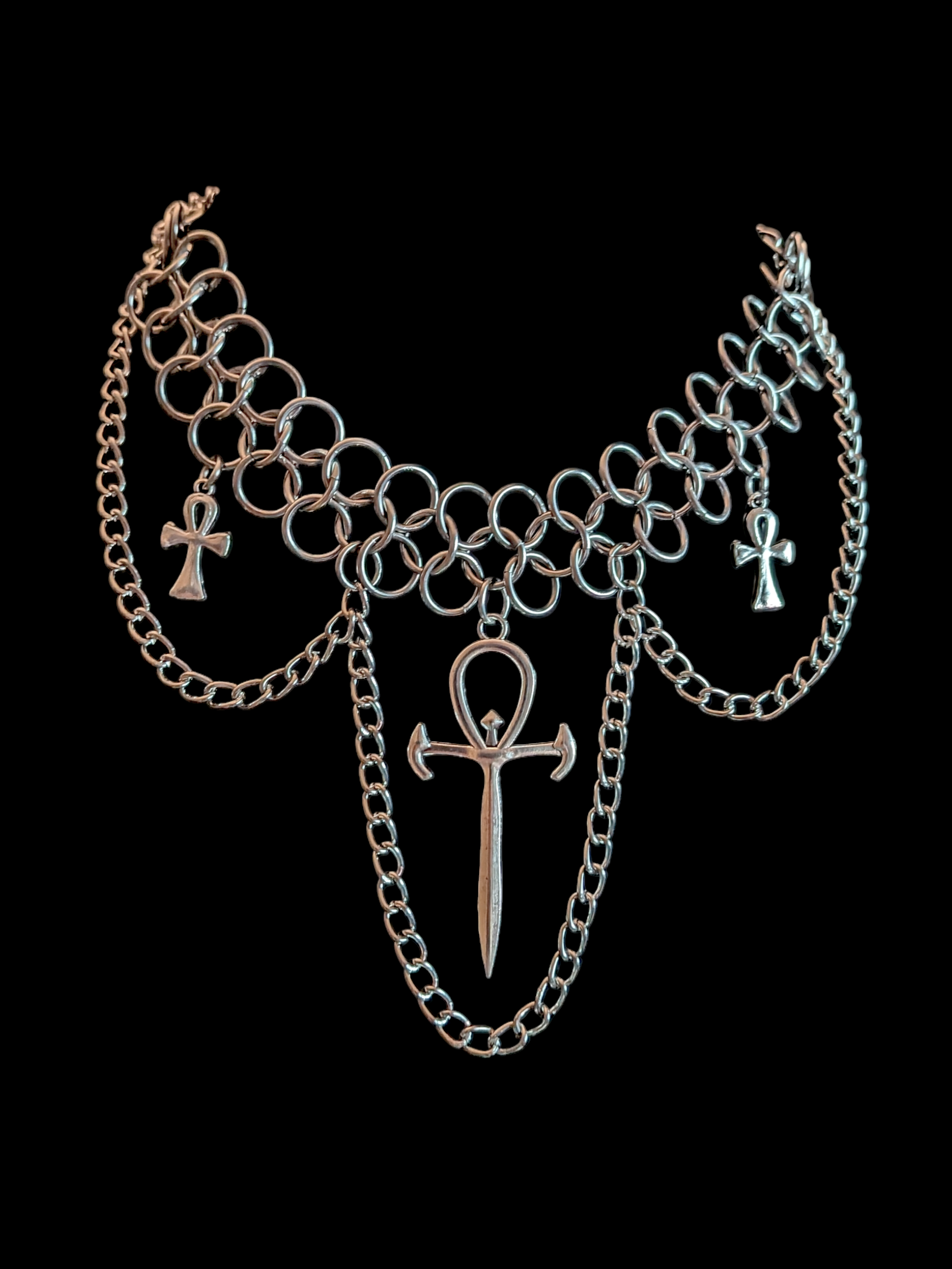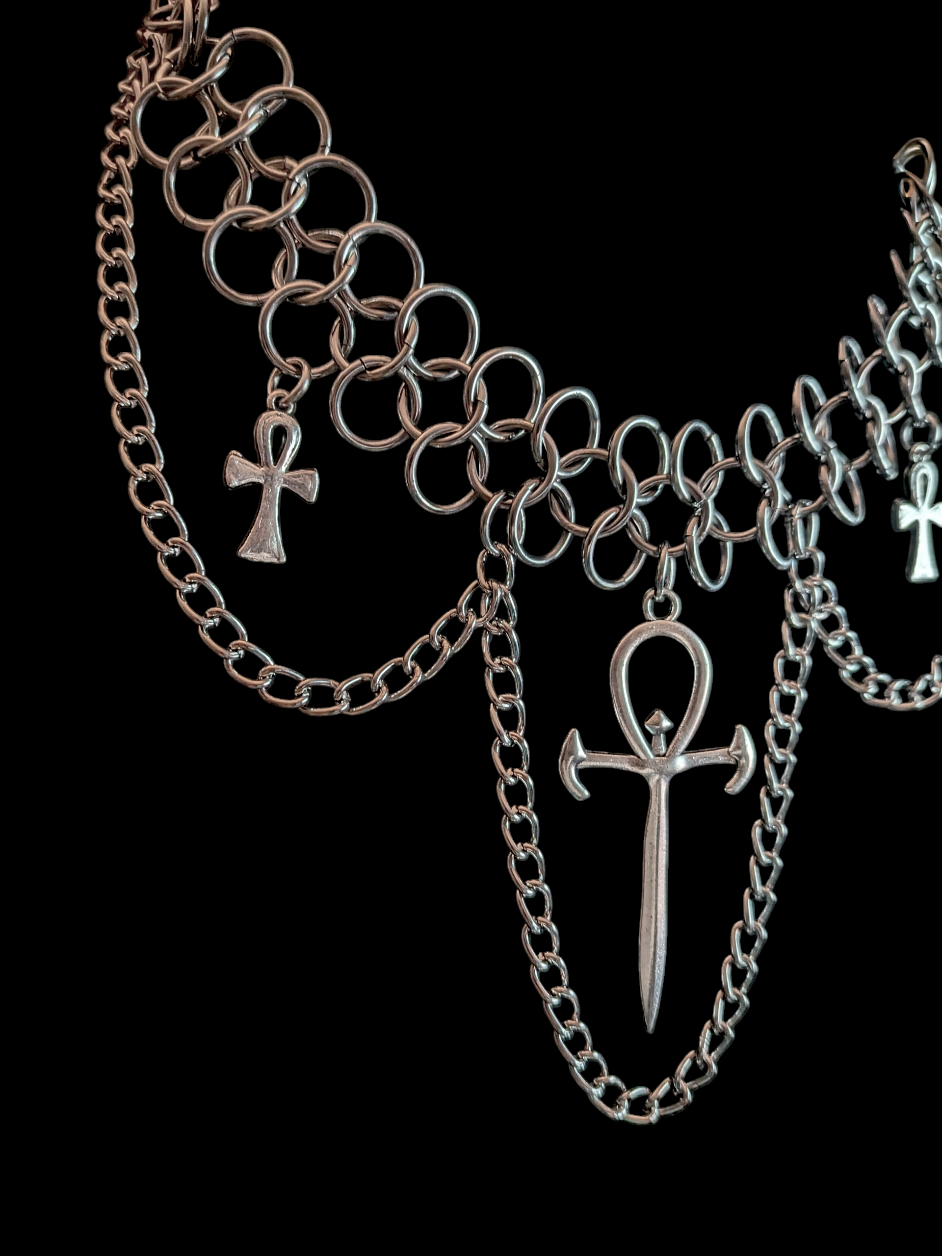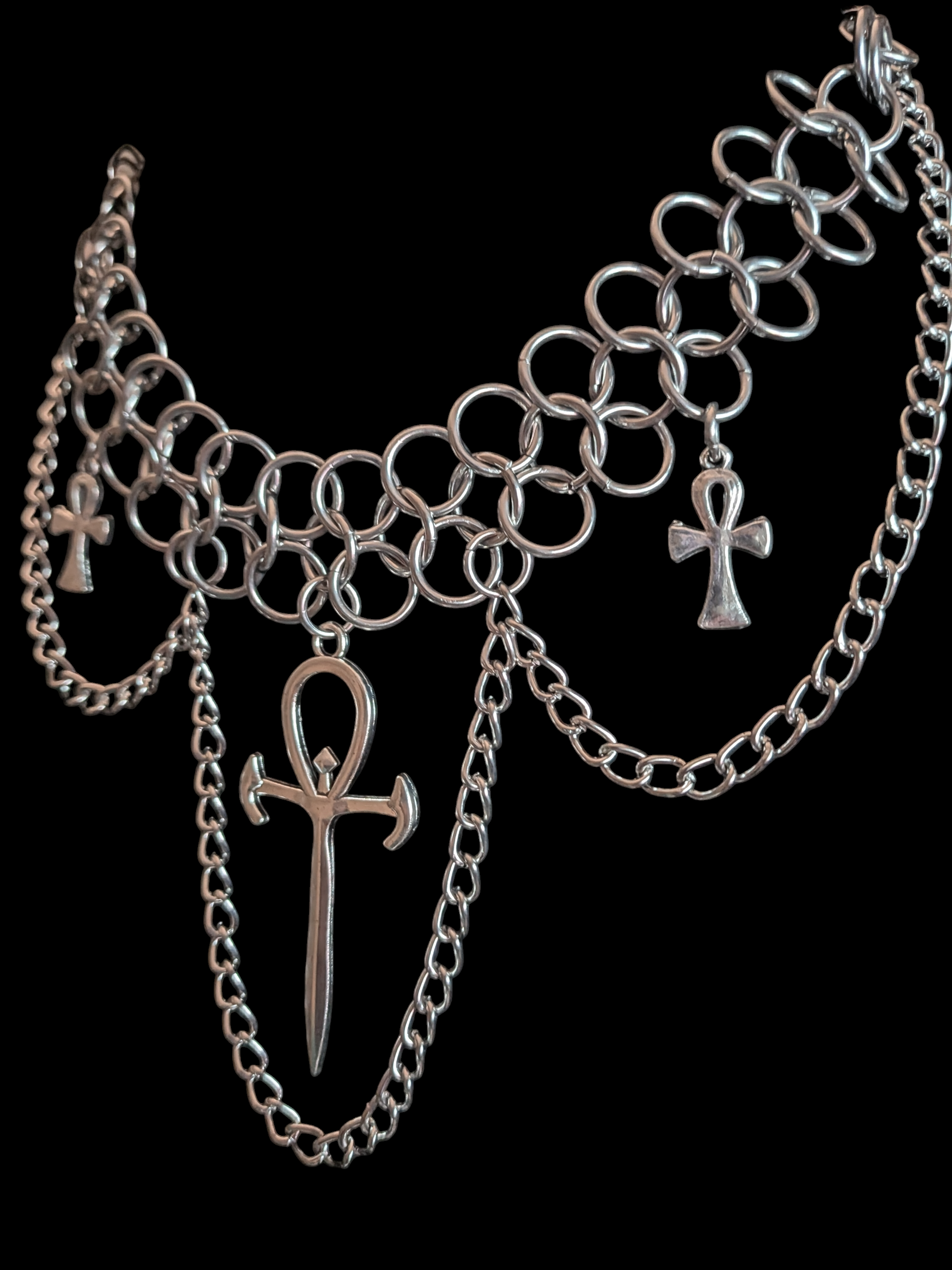 Handcrafted stainless steel chainmail choker piece draped with nickel-free rhodium plated iron chain and ankh charms. Adjustable and replicable!
