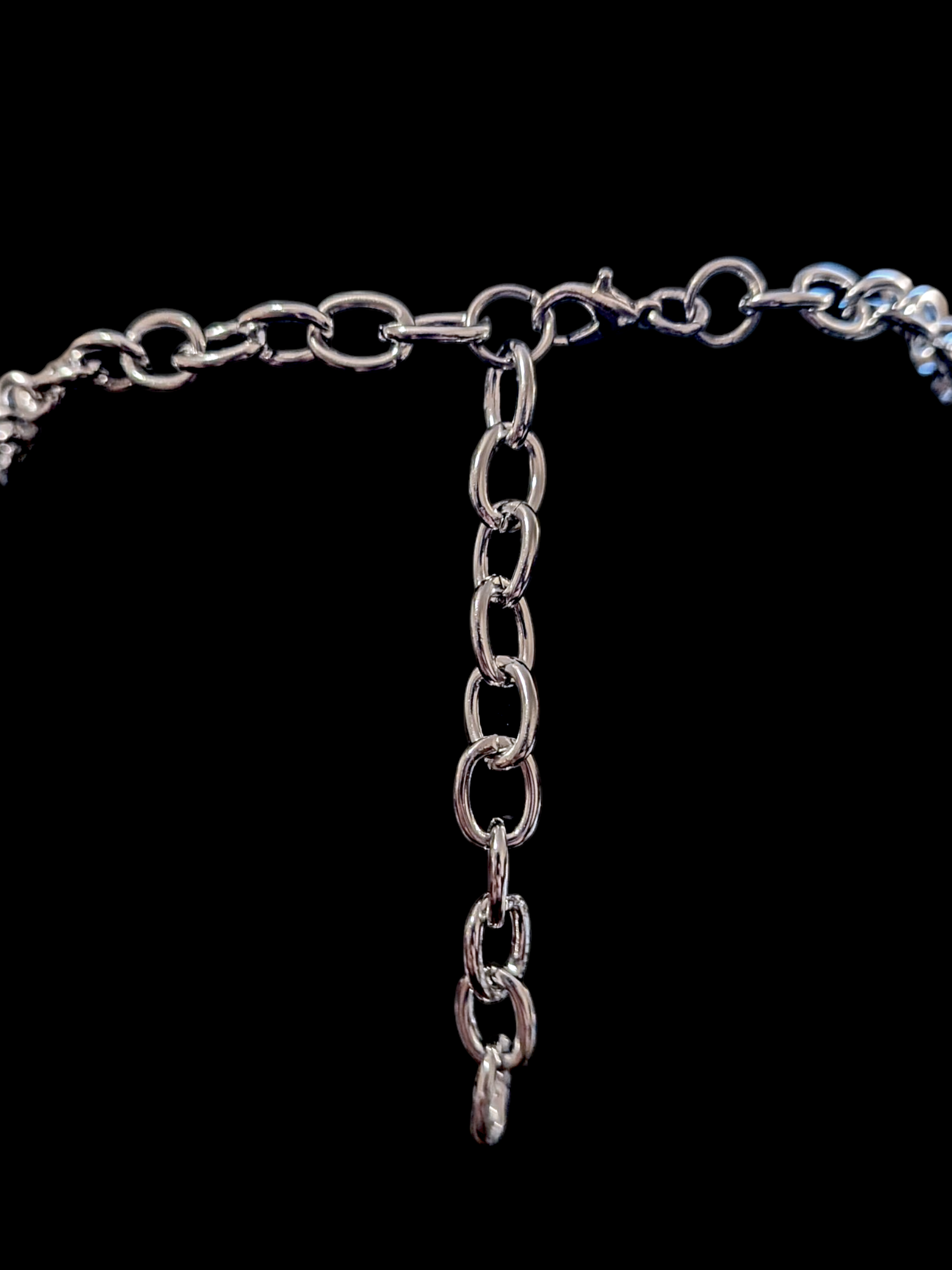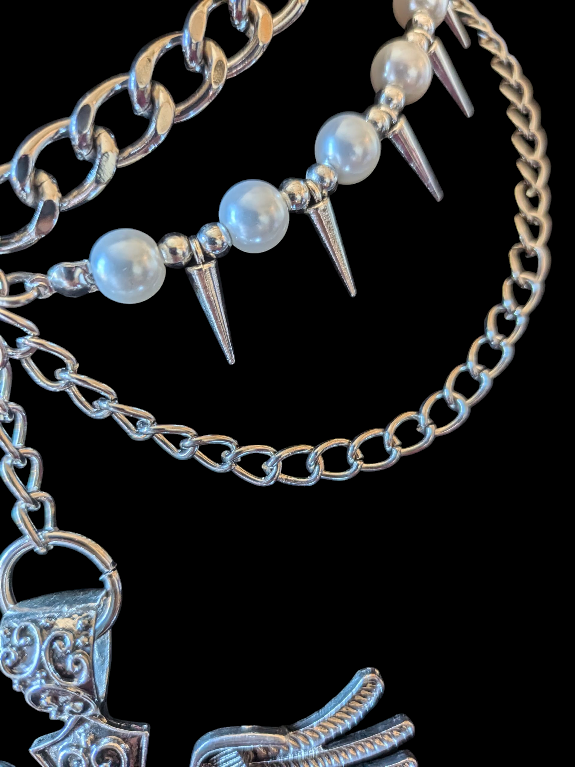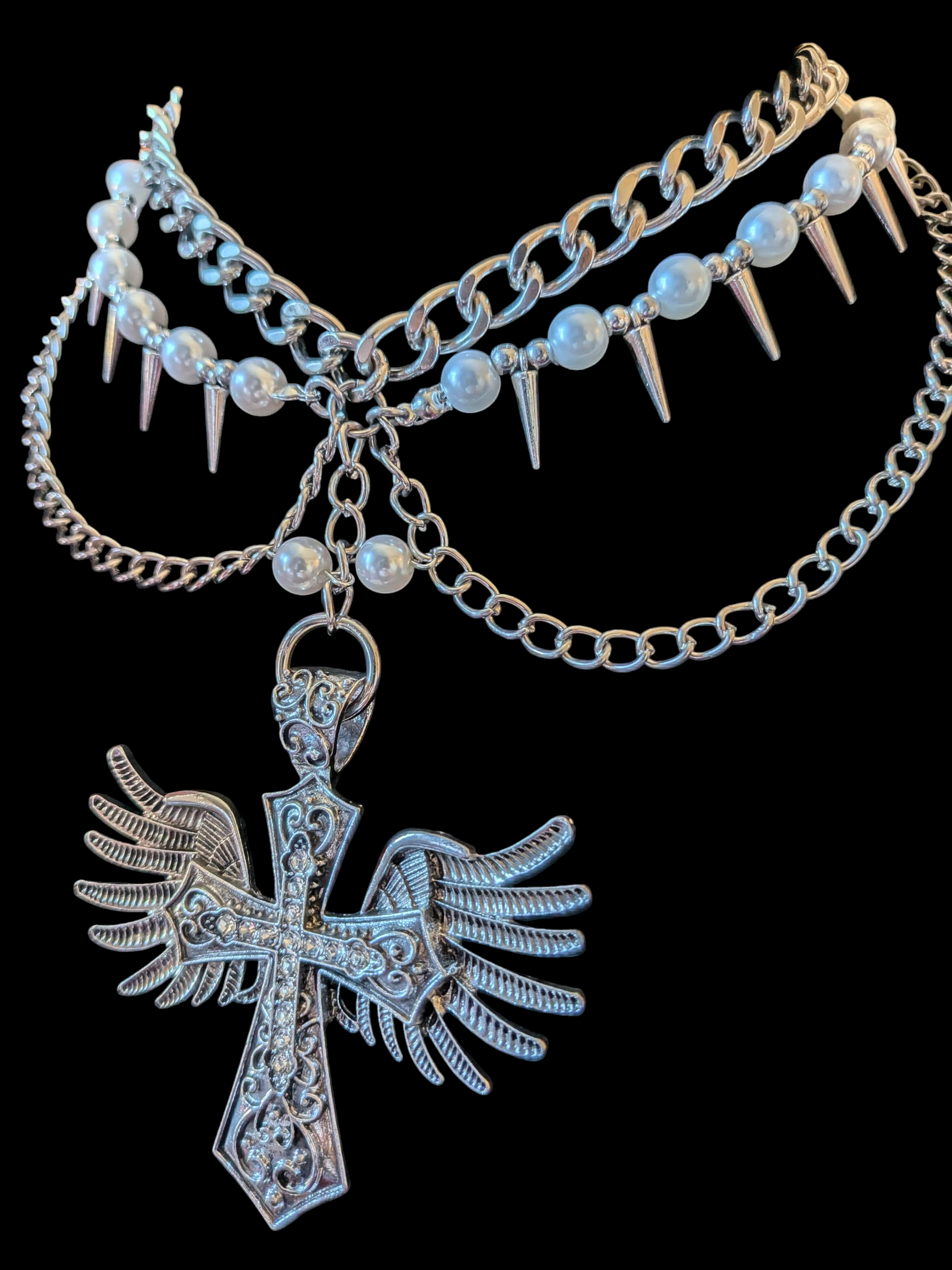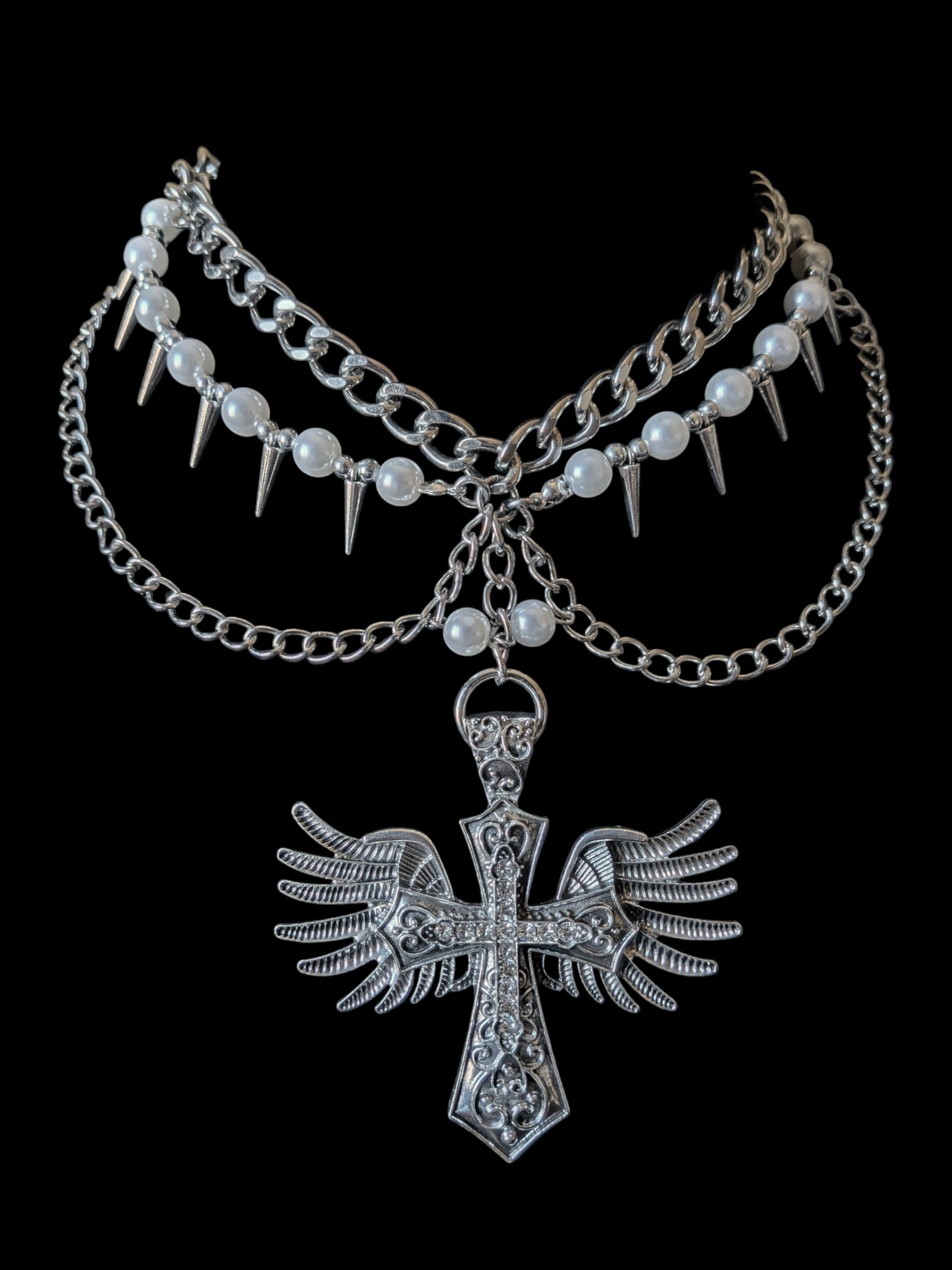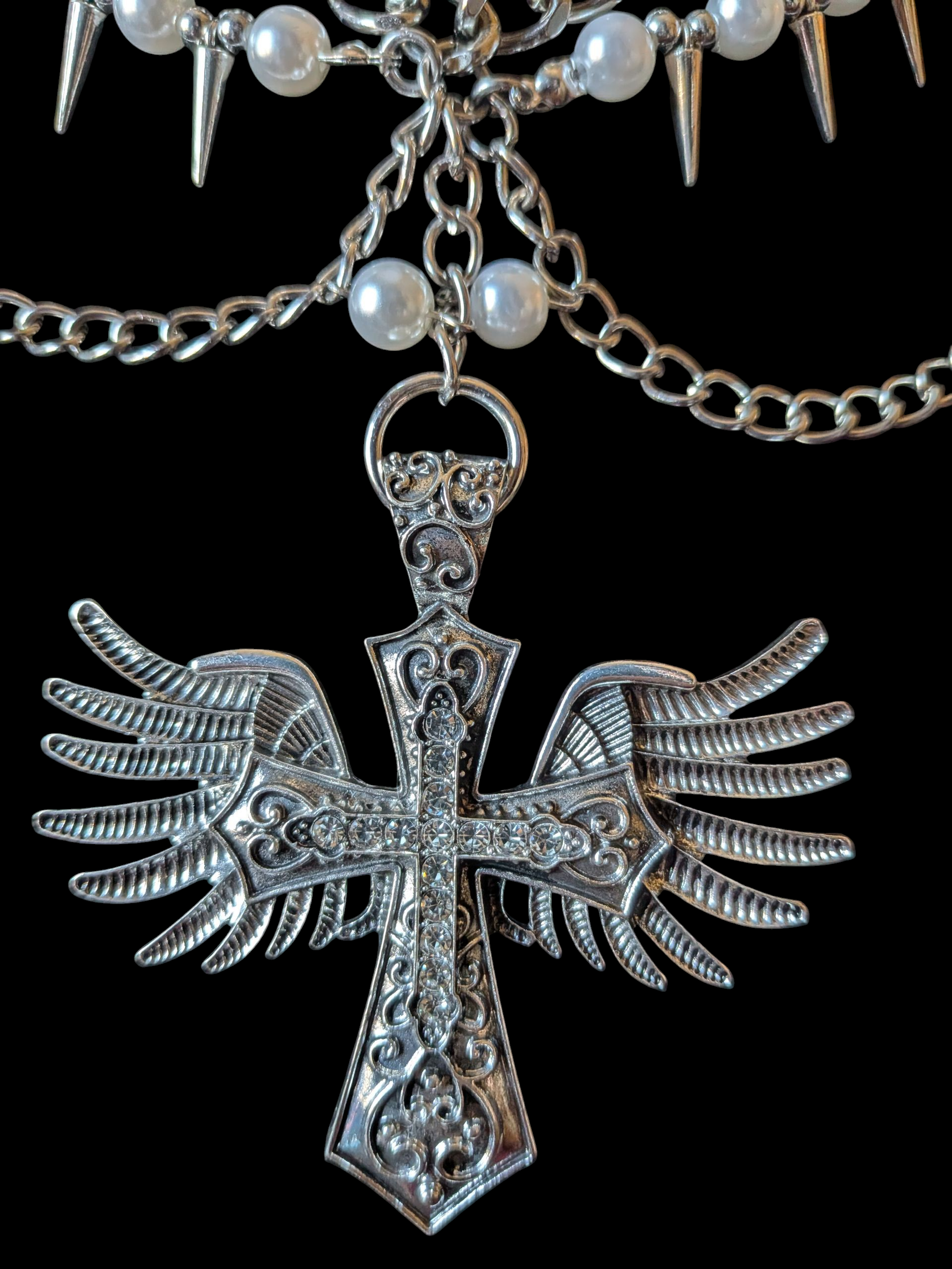 Handcrafted Gothic spike and pearl necklace decorated with a large winged cross. REPLICABLE