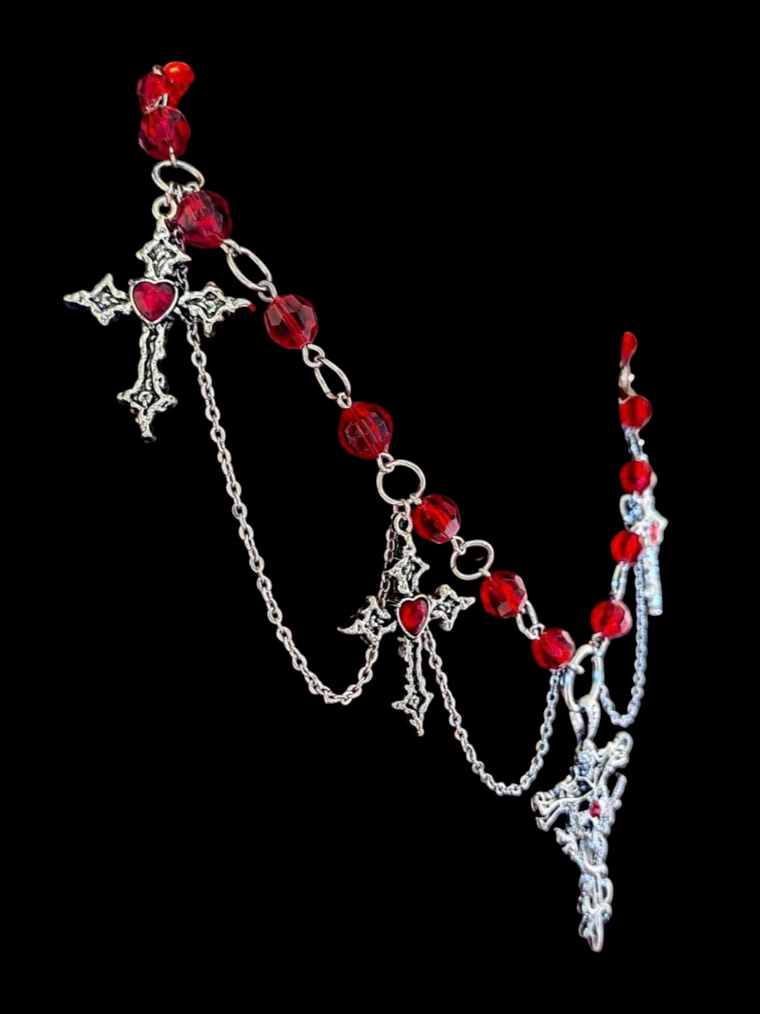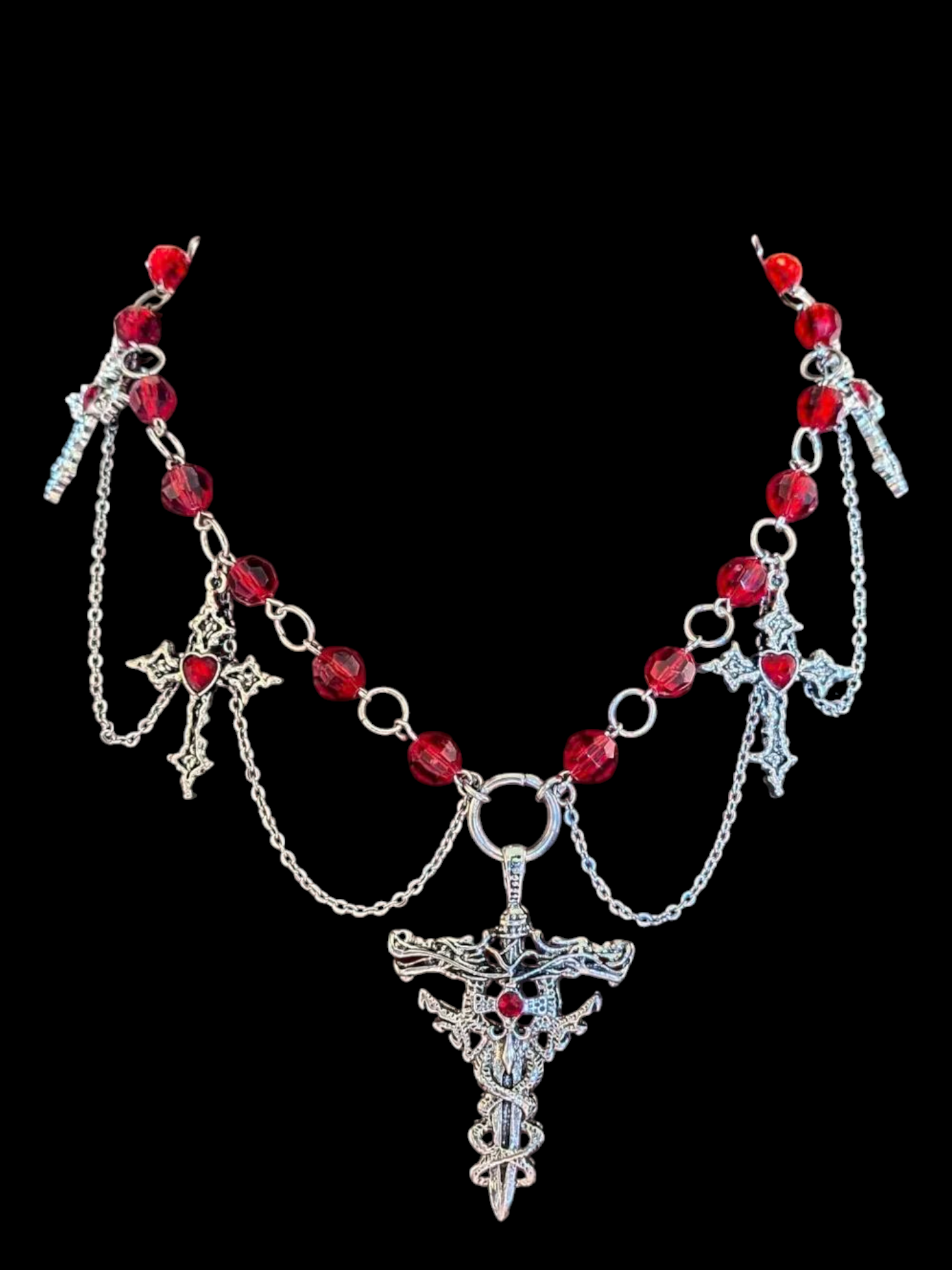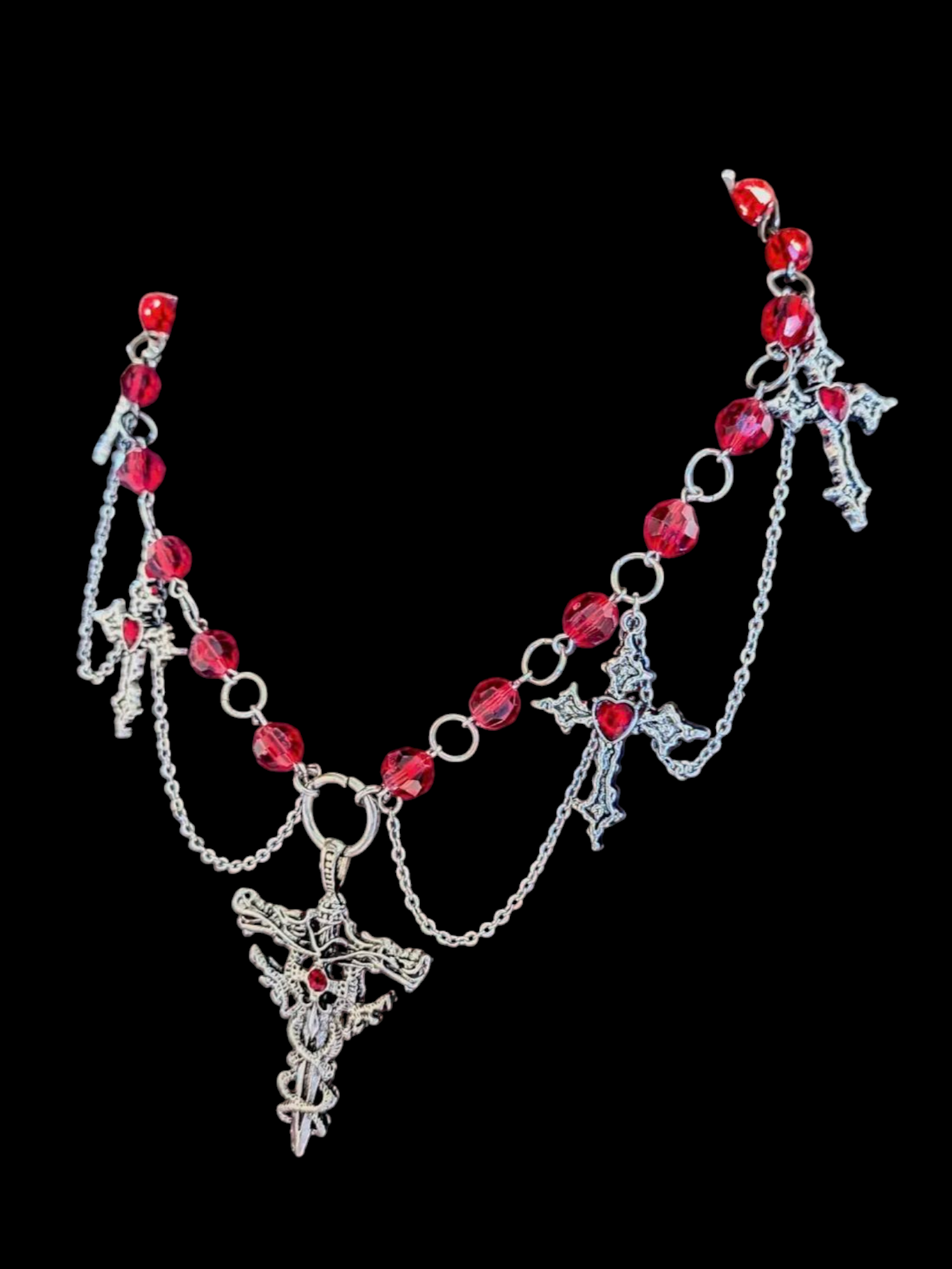 Handcrafted Gothic red and silver beaded and chained necklace. REPLICABLE