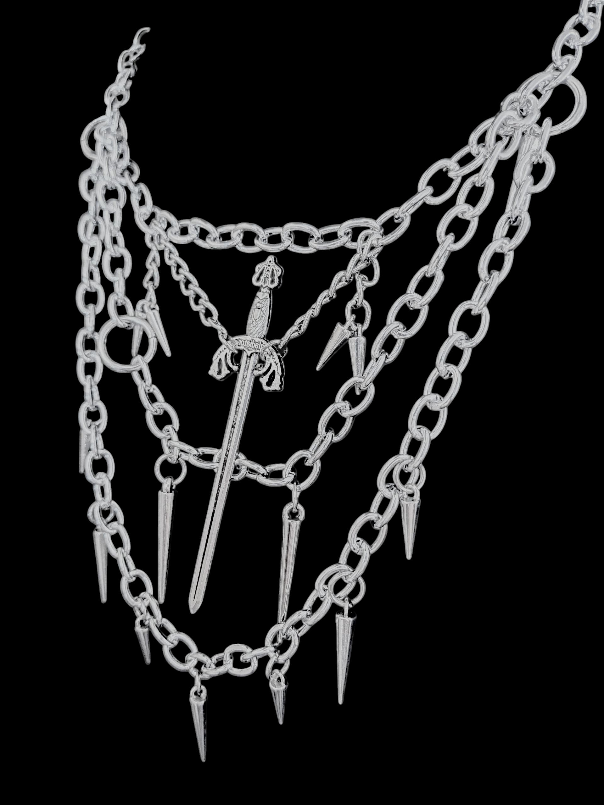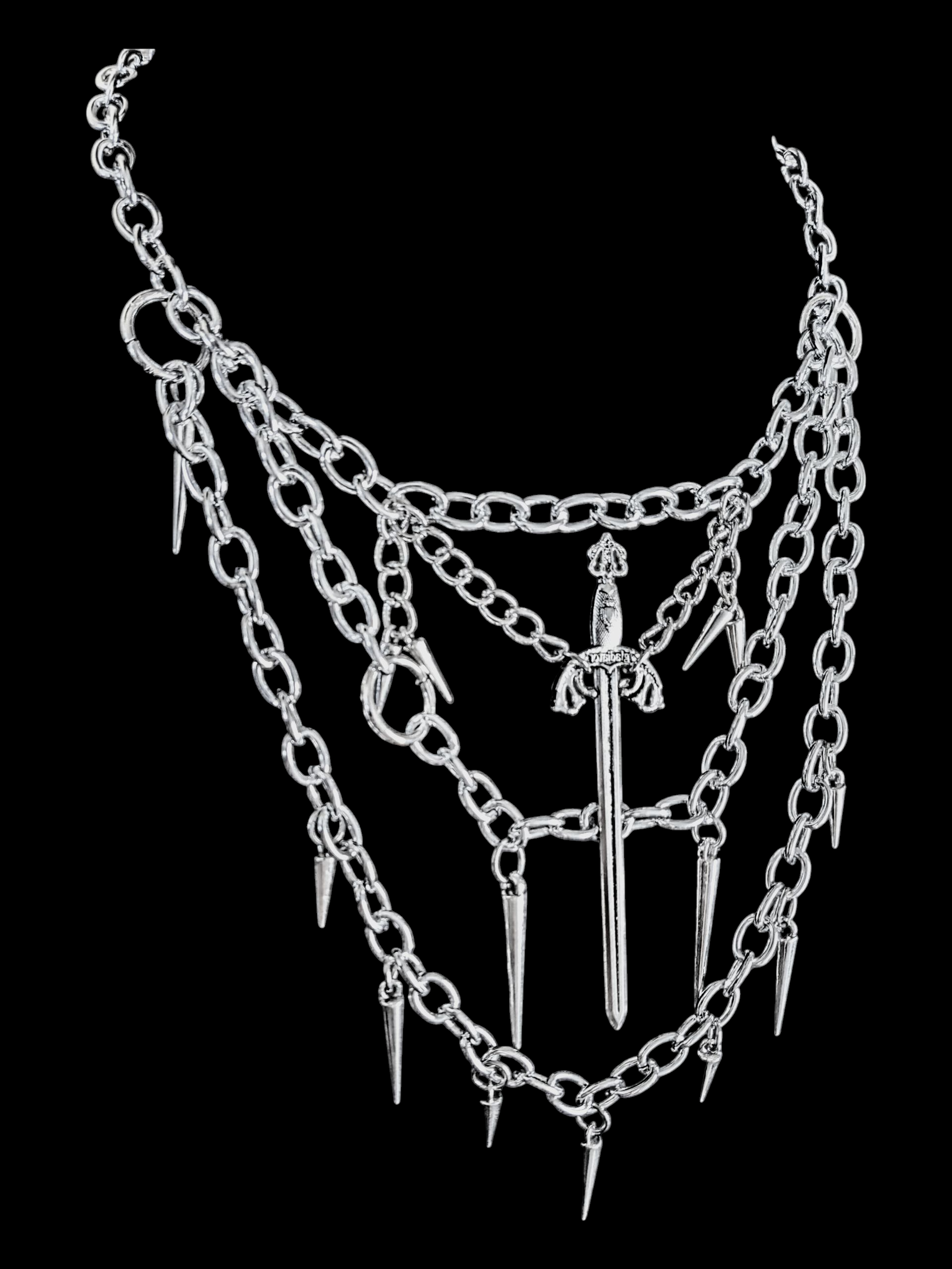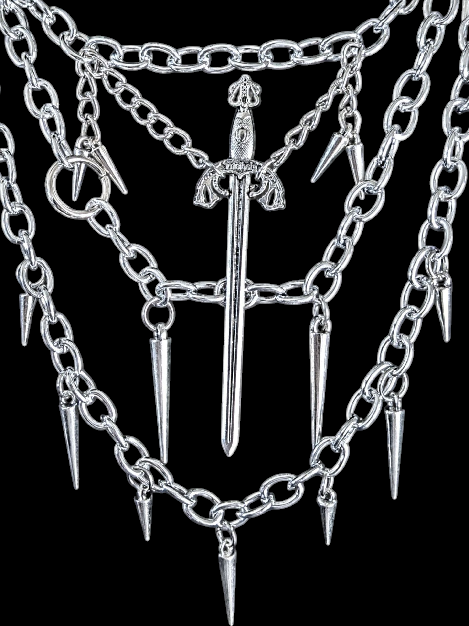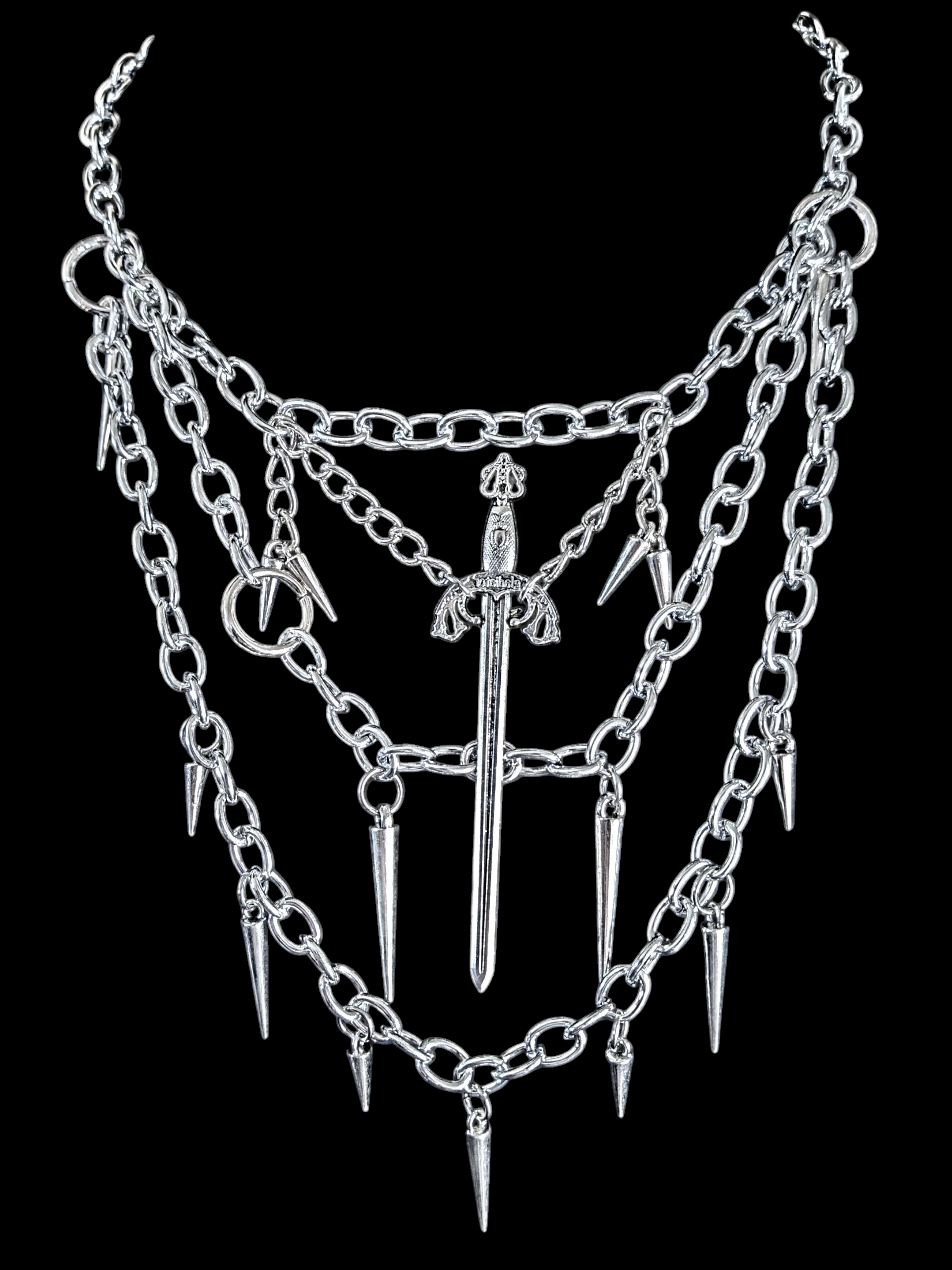 REPLICABLE Handmade chain necklace, centerpieced with a large sword charm surrounded by layered chains and spikes. This piece is cute, simple, and can be styles several ways.